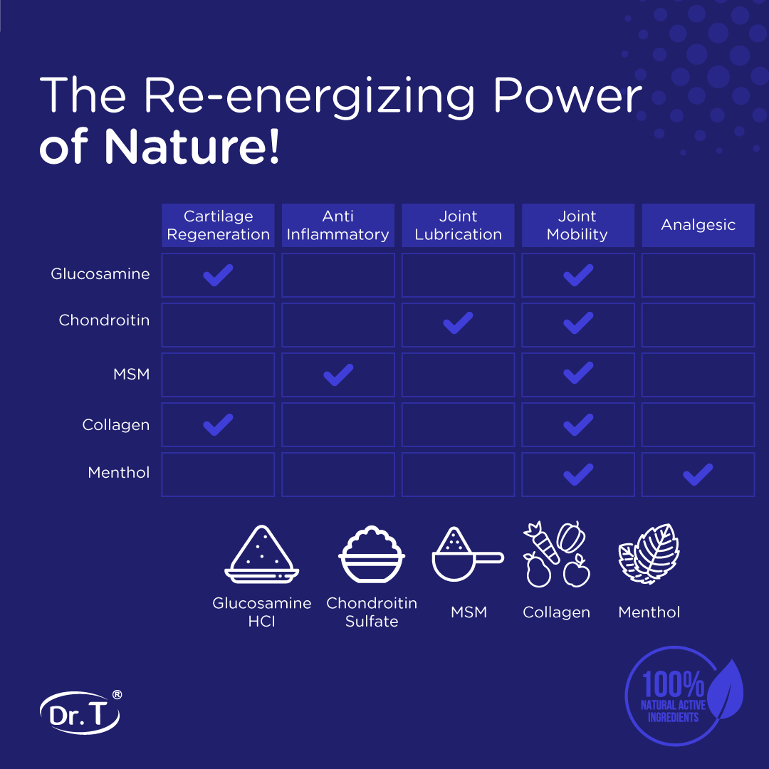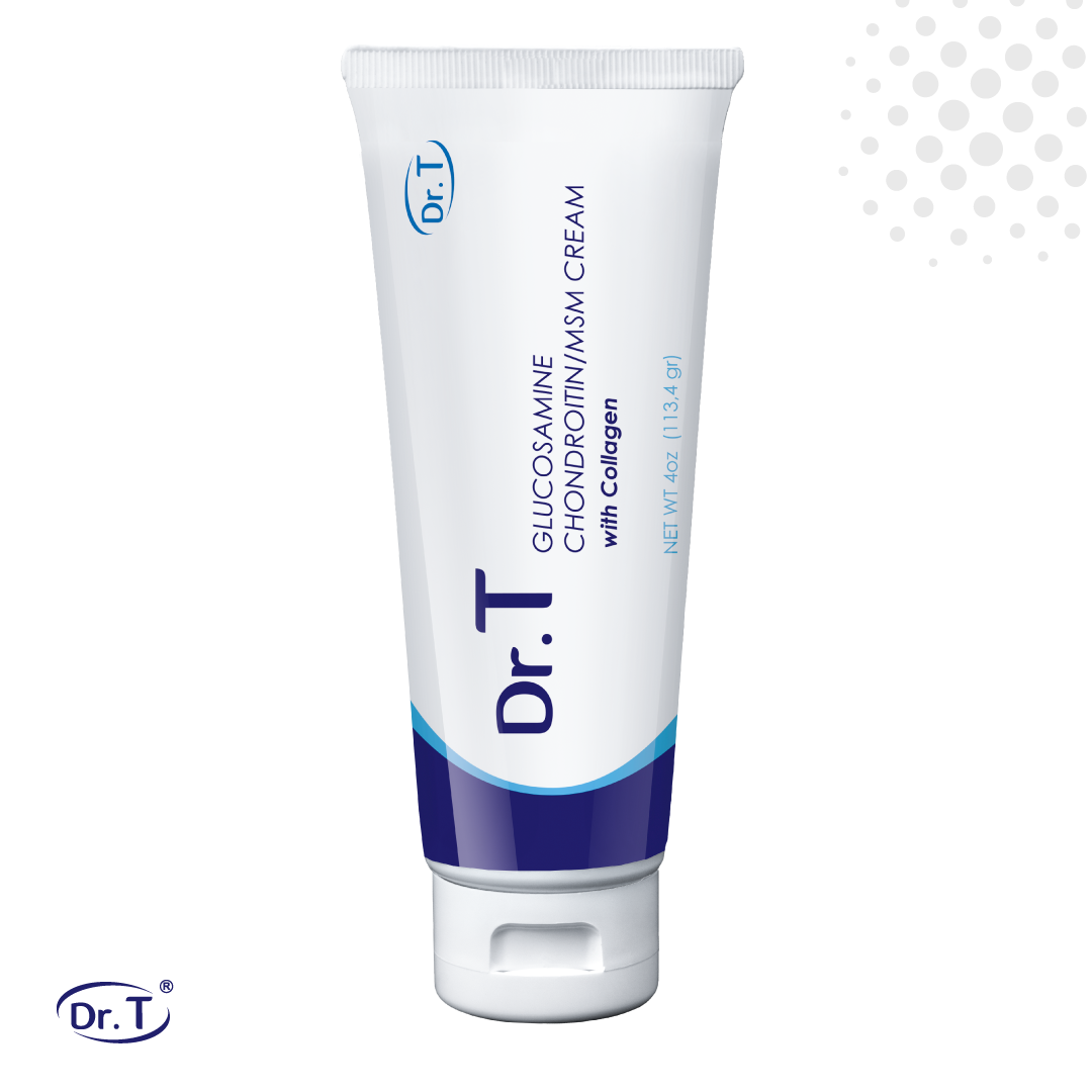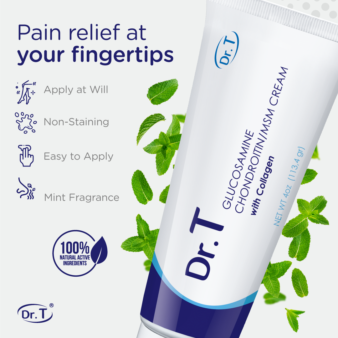 Fast-acting cream with glucosamine, chondroitin, MSM, and collagen for relief of joint discomfort, stiffness, and muscle aches.