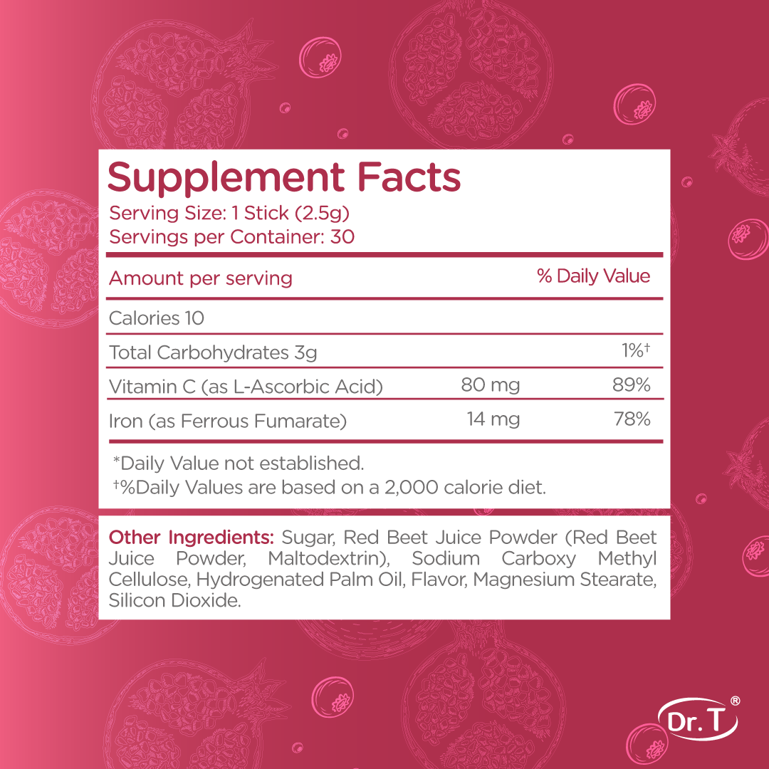 Quick-dissolving, no-water-needed iron powder to support energy, oxygen transport, and red blood cell production.